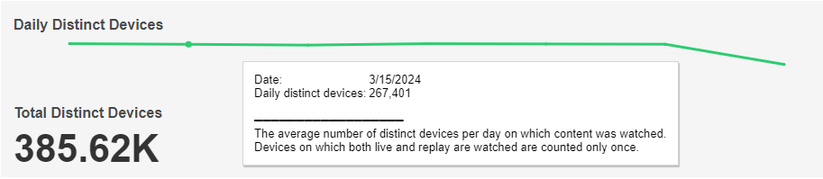 Below the top-left drop-down menus, the report shows a chart and count for Total Daily Distinct Devices based on selected filters. The mouseover tooltip gives further information and definitions.