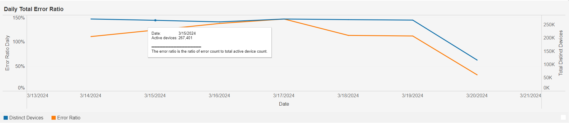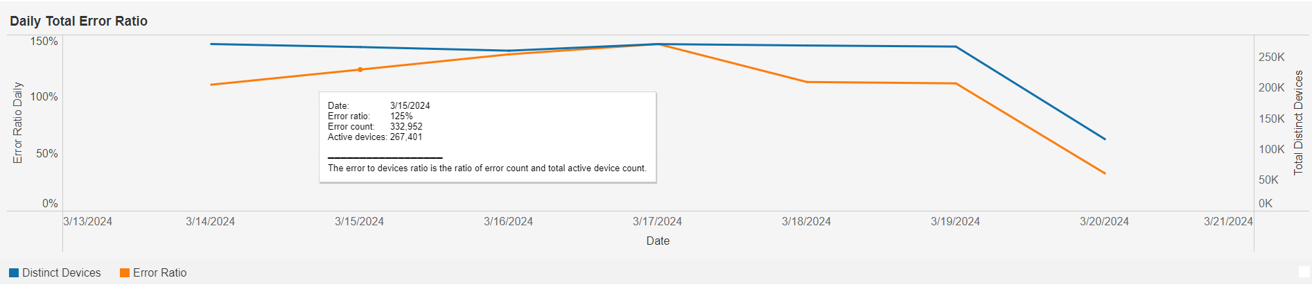 This graph shows the daily percentage error ratio and total distinct device count over time based on the selected filters. Individual lines can be highlighted by single-clicking. A mouseover tooltip on each line gives further information and definitions.