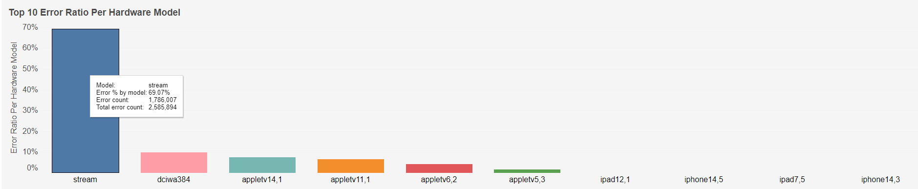 This chart ranks the reported error ratio percentage per hardware model. Individual bars can be highlighted by single-clicking. The mouseover tooltip gives further information.