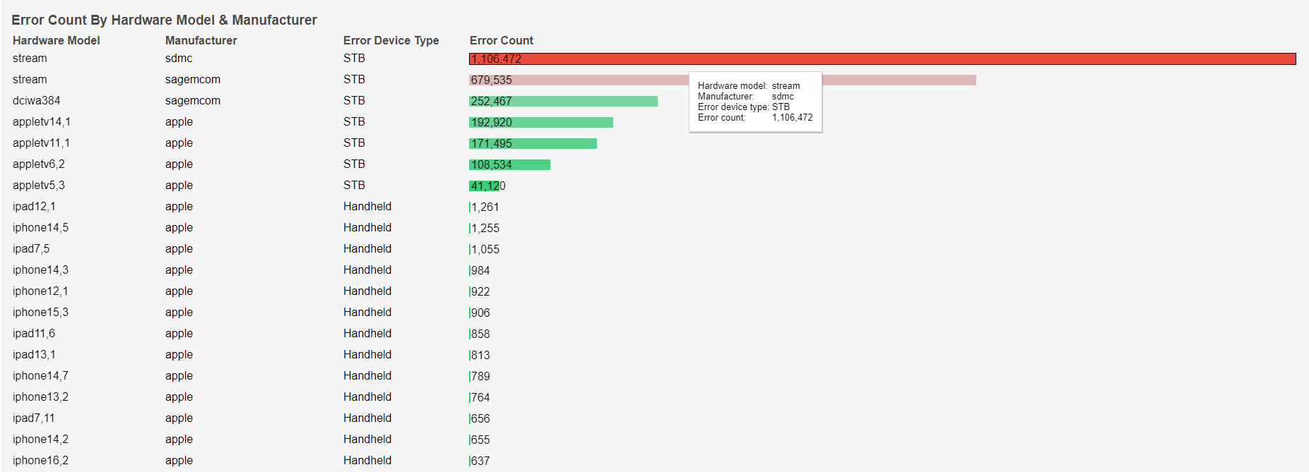Error Count By Hardware Model & Manufacturer
