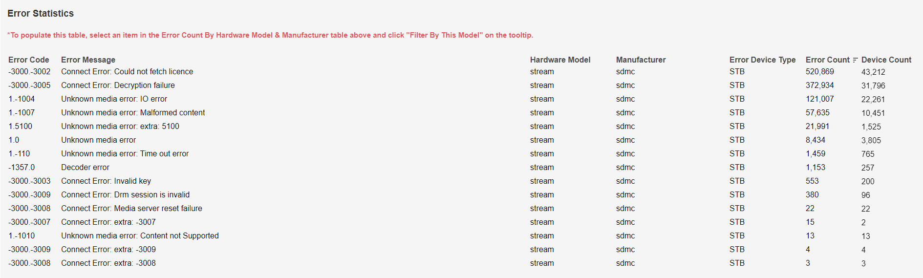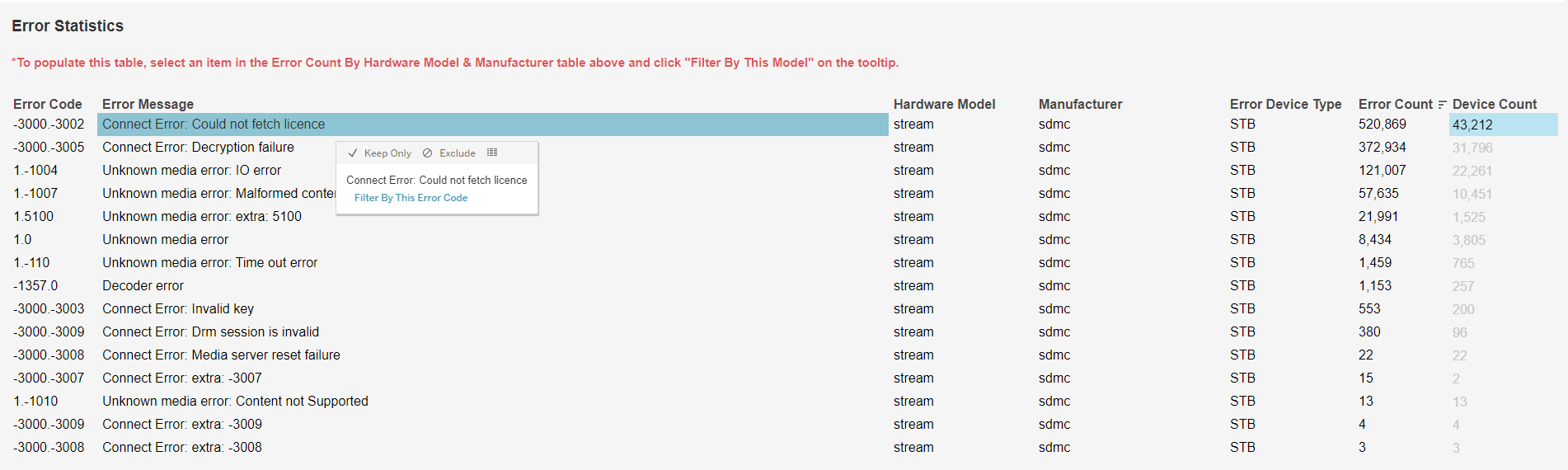 After clicking Filter By This Model in the Error Count column tooltip, the blank Error Statistics table becomes populated with further information.