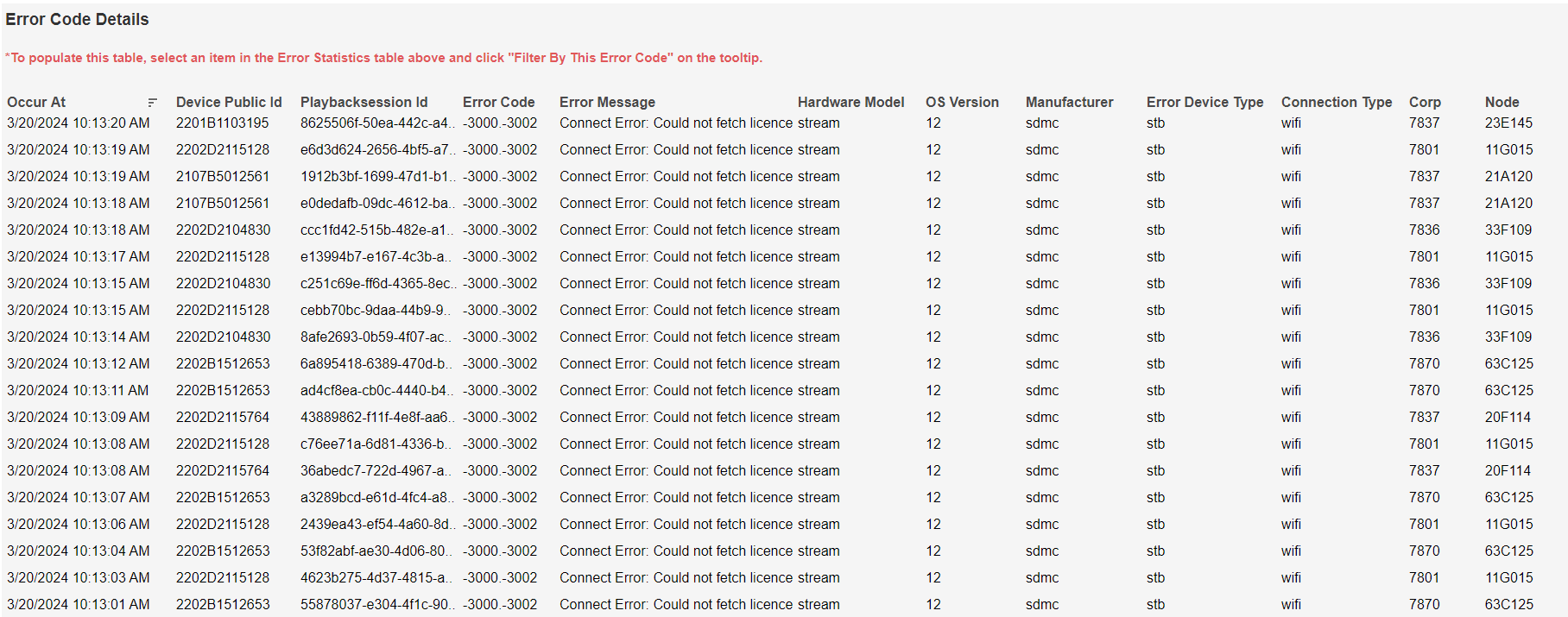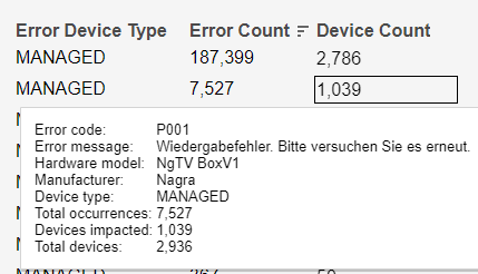 After clicking Filter By This Error Code in the Error Message column tooltip, the blank Error Code Details table becomes populated with further information. The mouseover tooltip on the last table column gives further information.