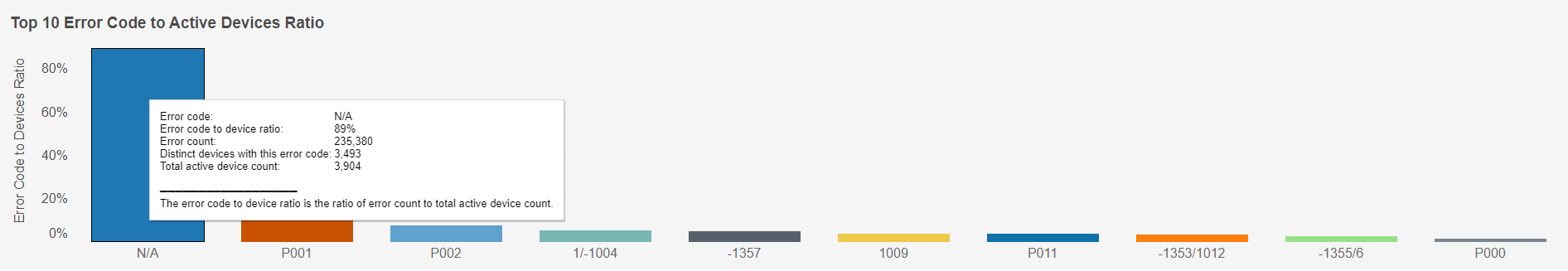 This chart ranks the density of error codes per device by giving the percentage ratio of distinct devices reporting a given error code to total active device count. Individual bars can be highlighted by single-clicking. The mouseover tooltip gives further information and definitions.