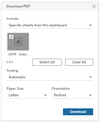 The downloaded PDF will have an extra line at the end due to a Tableau limitation. A workaround is available – see https://kb.tableau.com/articles/howto/removing-abc-placeholder-text.