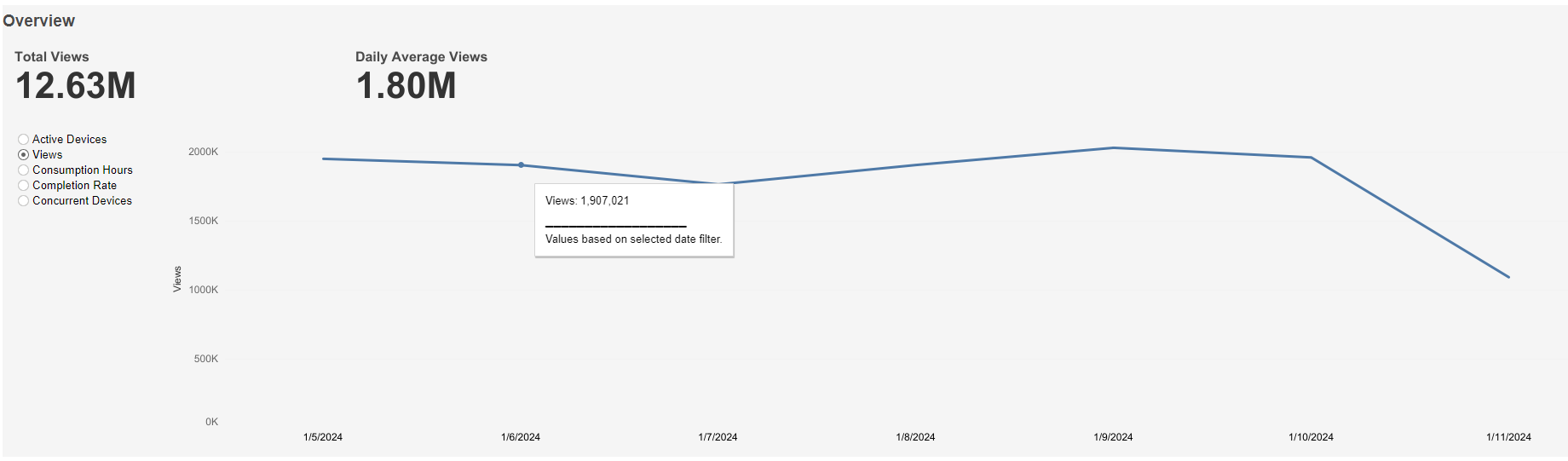 This graph shows Total Views at the top left, Daily Average Views at the top right, and a graph of Views over time based on the selected time interval. A mouseover tooltip gives further information.