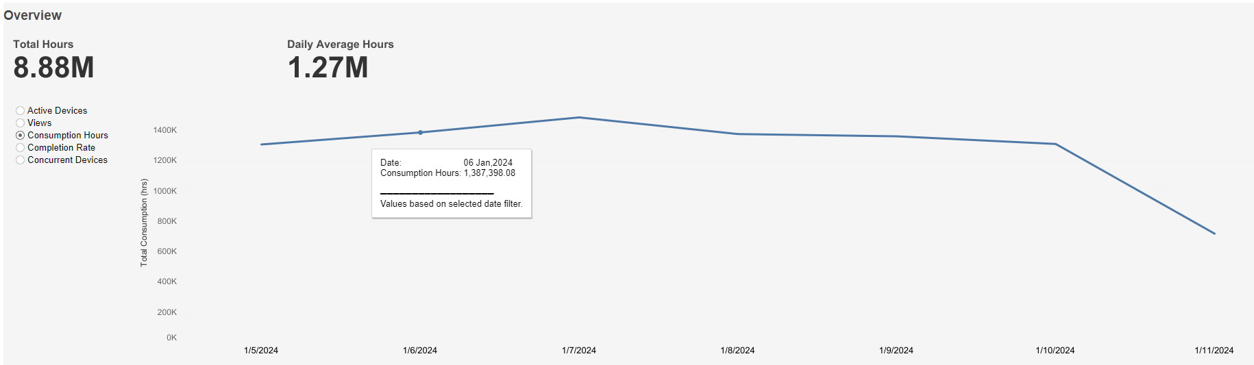 This graph shows Total Hours at the top left, Daily Average Hours at the top right, and a graph of Consumption Hours over time based on the selected time interval. A mouseover tooltip gives further information.