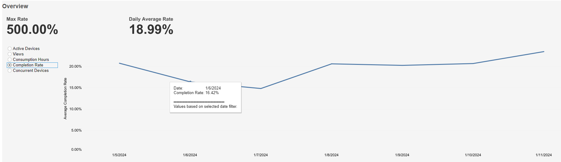 This graph shows Max Rate at the top left, Daily Average Rate at the top right, and a graph of Average Completion Rate over time based on the selected time interval. A mouseover tooltip gives further information.