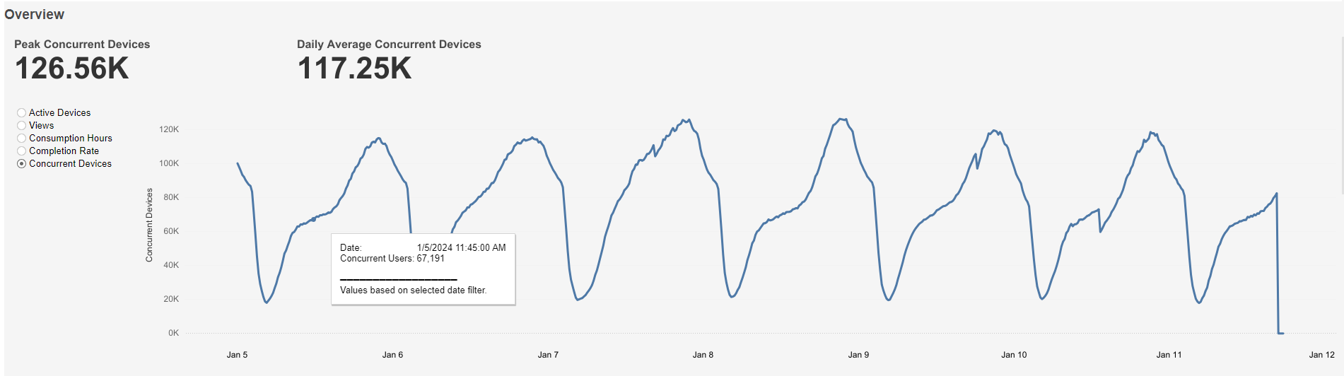 This graph shows Peak Concurrent Devices at the top left, Daily Average Concurrent Devices at the top right, and a graph of Concurrent Users over time based on the selected time interval. A mouseover tooltip gives further information.