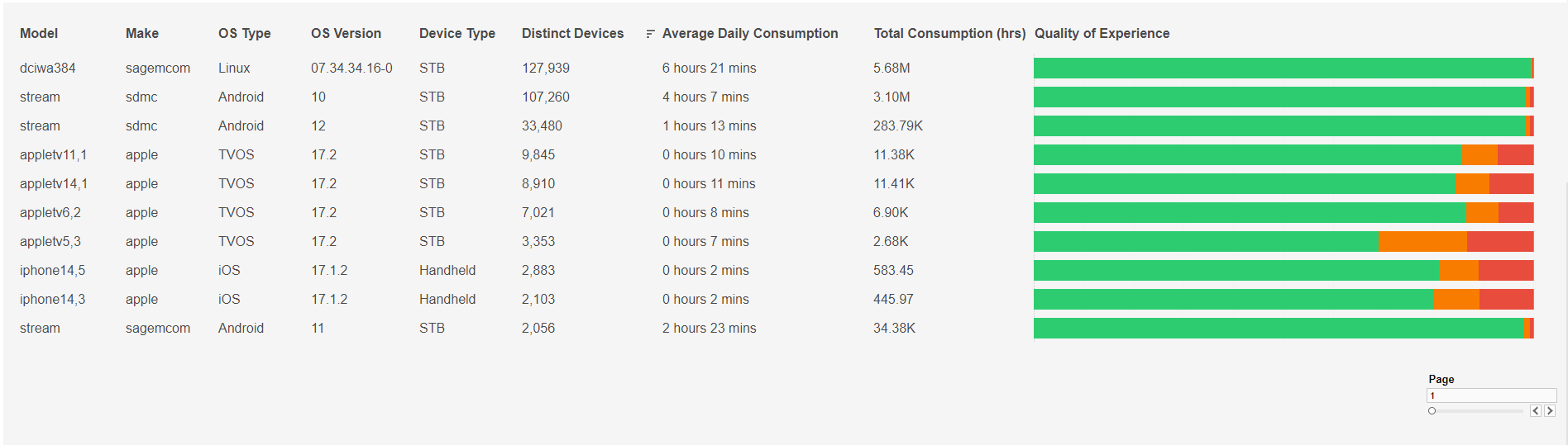 Finally, the report shows a table for Model Details, with columns for Model, Make, OS Type, OS Version, Device Type, Distinct Devices, Average Daily Consumption, Total Consumption, and QoE.