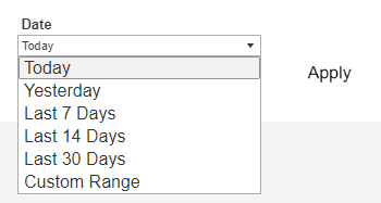 The top right of the page shows a Date drop-down menu, with preset time intervals for Today, Yesterday, Last 7 days, Last 14 days, and Last 30 days. Selecting one of these options then clicking Apply loads the data.