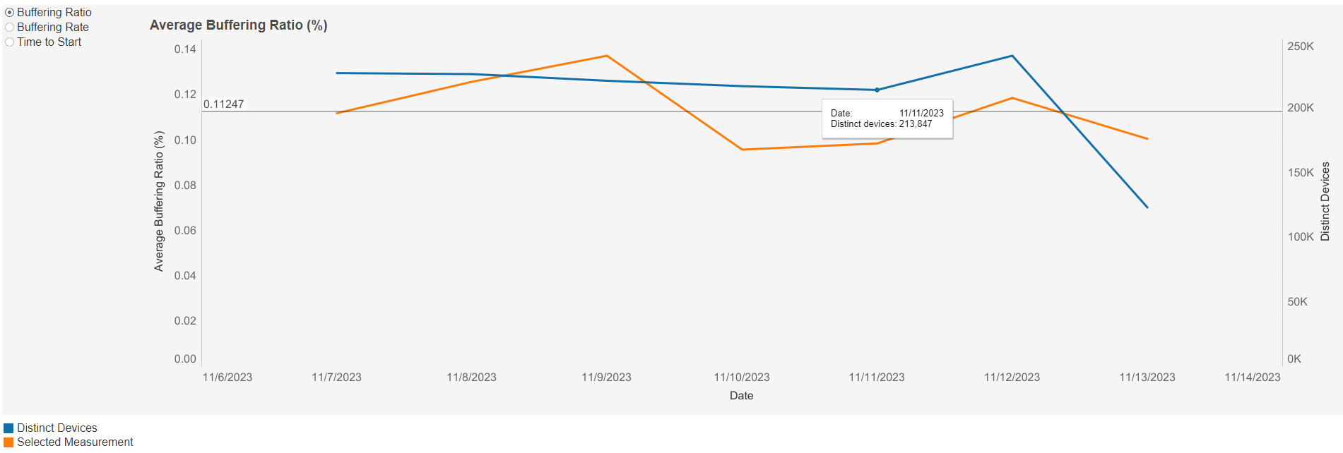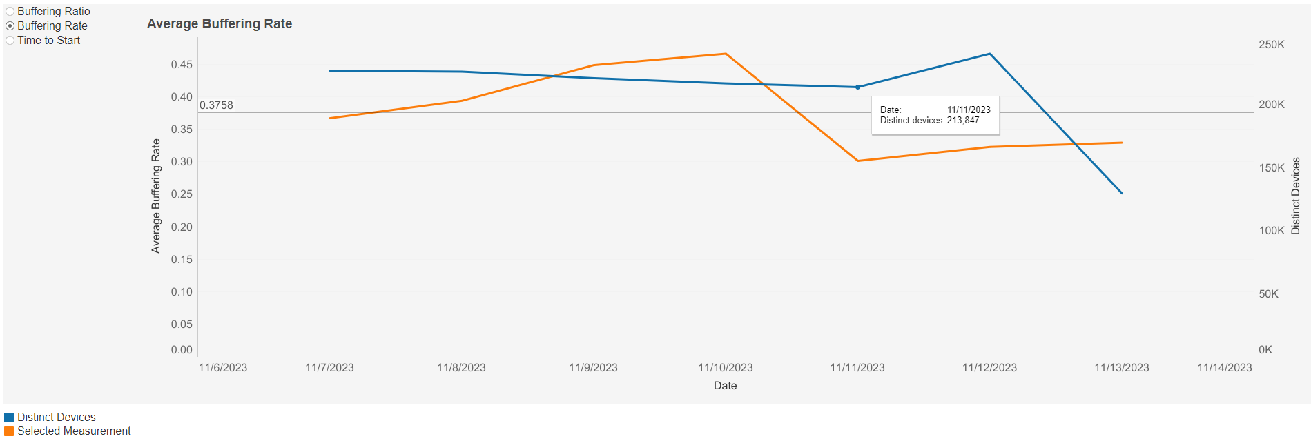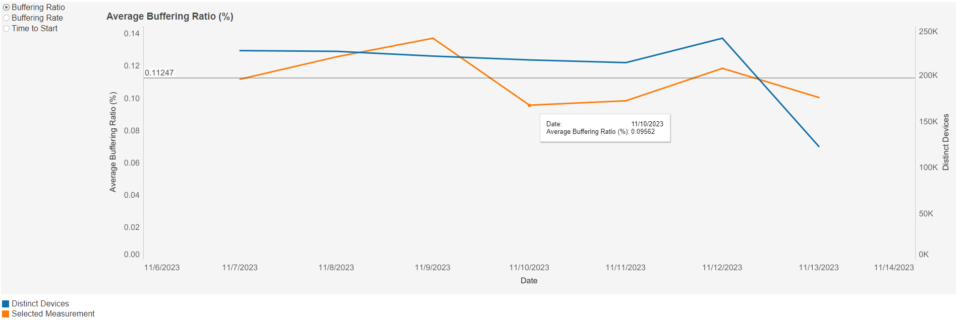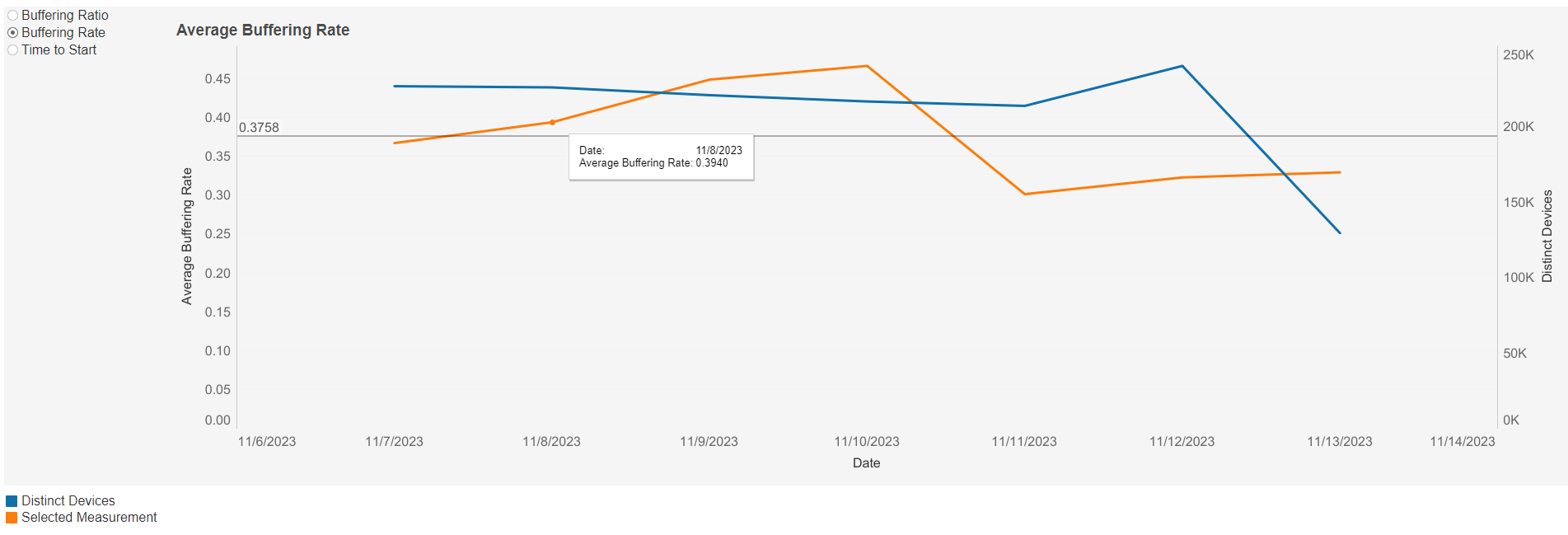 This graph shows the average buffering rate over time based on the selected filters. Individual lines can be highlighted by single-clicking. A colour legend is shown at the bottom left below the graph.