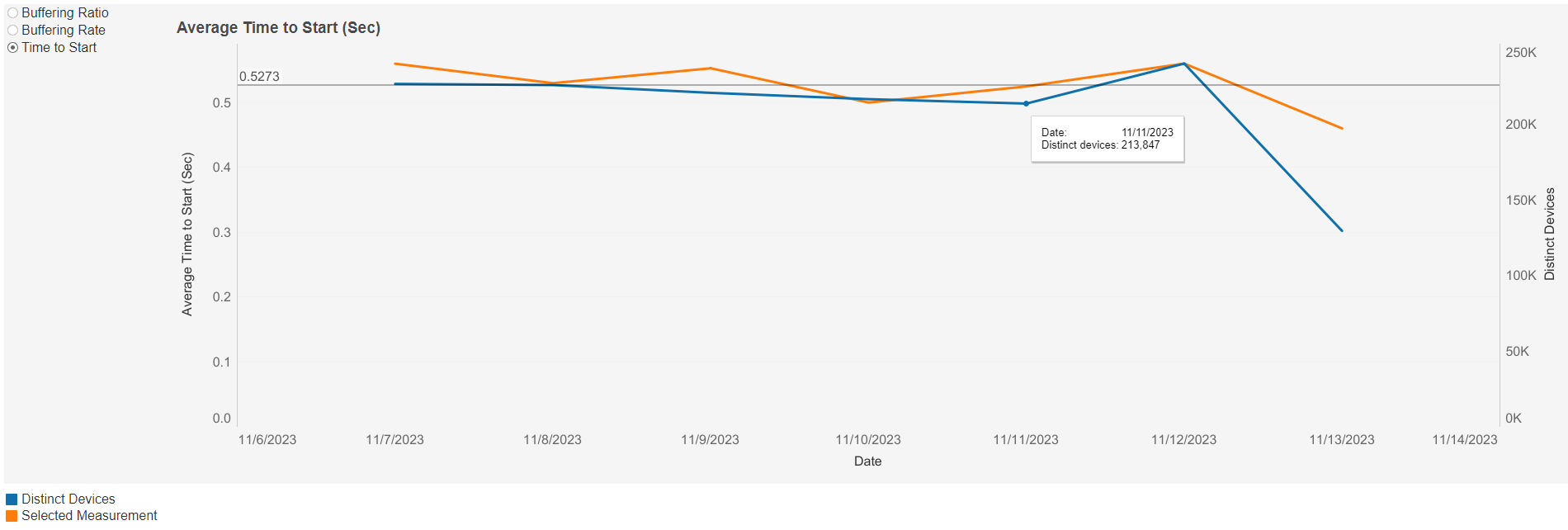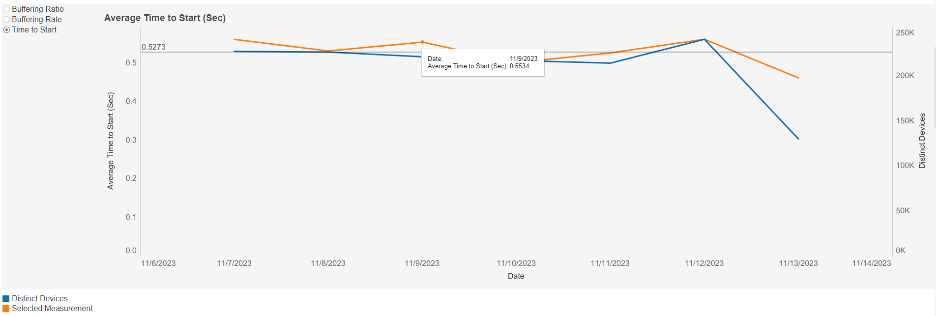 This chart shows the number of playback sessions whose average playout start times lie within each 500ms time interval, based on the selected date interval and filters.
