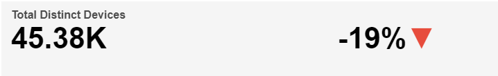 Below the Reporting Period, the report shows Total Distinct Devices based on the selected time interval. The Total Distinct Device count based on the selected time interval is shown with the percentage change in Total Distinct Device count compared to the directly preceding time interval and an up/down/neutral indicator arrow. A mouseover tooltip for each measure gives further information and definitions.