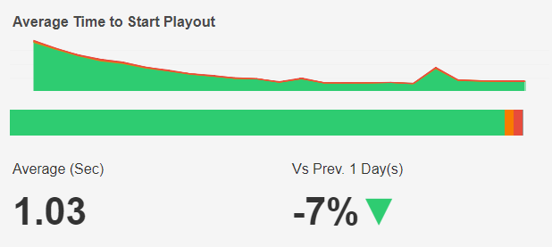 The Average Time to Start Playout based on the selected time interval and filters is shown at the bottom left and the percentage change compared to the directly preceding time interval is shown with an up/down/neutral indicator arrowat the bottom right.