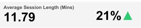 Next, the report shows Average Session Length (Mins) based on the selected time interval. The Average Session Length (Mins) count based on the selected time interval is shown with the percentage change in Average Session Length (Mins) count compared to the directly preceding time interval and an up/down/neutral indicator arrow. A mouseover tooltip for each measure gives further information and definitions.