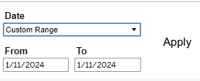 Users can also select Custom Range, which causes the From and To date fields to appear below, and allows users to specify any time interval (provided dates are not in the future). Users must then click Apply to load the data.