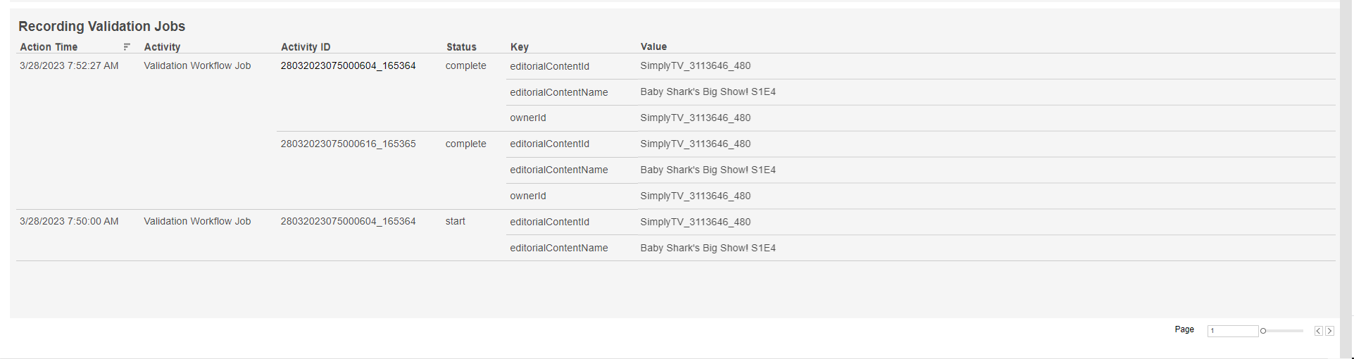 - A chart and a table that show recording validation jobs