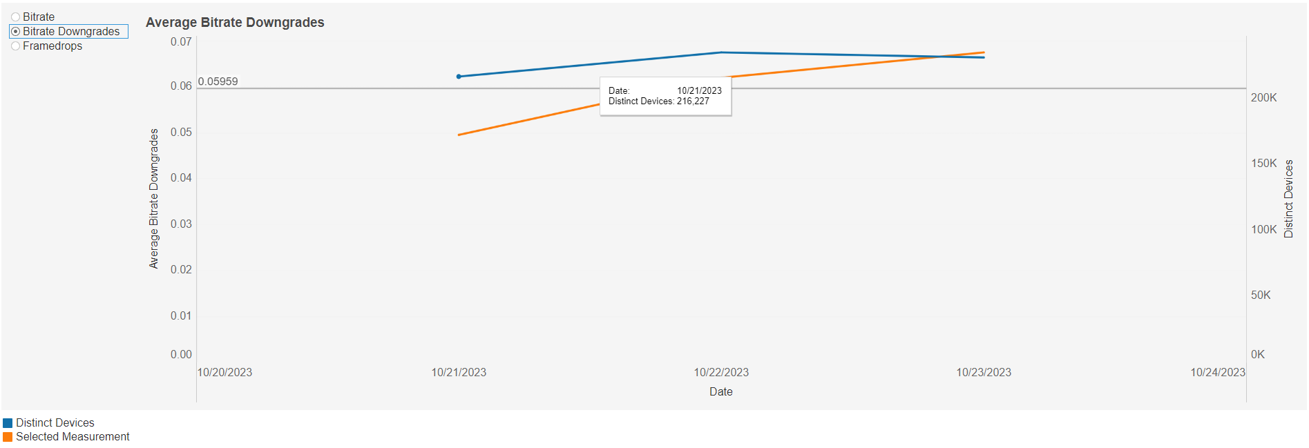 This chart and QoE bar show the count of instances where the bitrate was downgraded based on selected time interval and filters.