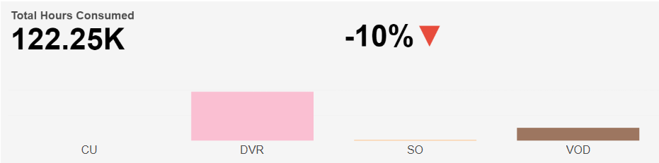 Below this, the report shows a bar chart for Total Hours Consumed, split into four watch categories: CU, DVR, SO, and VOD, based on the selected time interval.