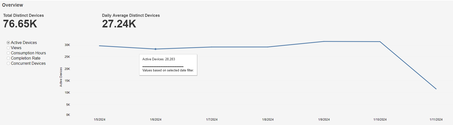 This graph shows Total Distinct Devices at the top left, Daily Average Distinct Devices at the top right, and a graph of Active Device count over time based on the selected time interval. A mouseover tooltip gives further information.