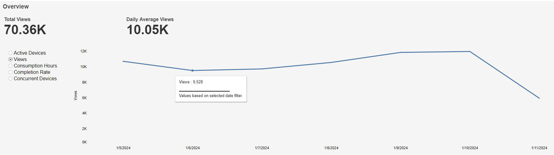 This graph shows Total Views at the top left, Daily Average Views at the top right, and a graph of Views over time based on the selected time interval. A mouseover tooltip gives further information.