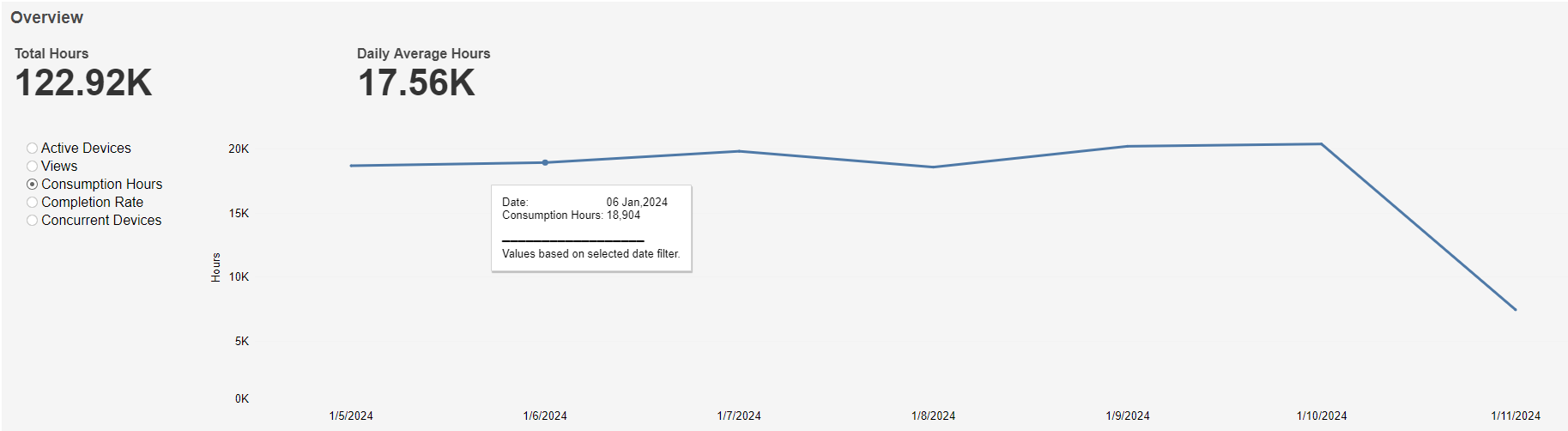 The Daily Consumption In Hours based on the selected time interval is shown at the top left and the percentage change in Daily Consumption In Hours compared to the directly preceding time interval is shown with an up/down/neutral indicator arrow at the top right.