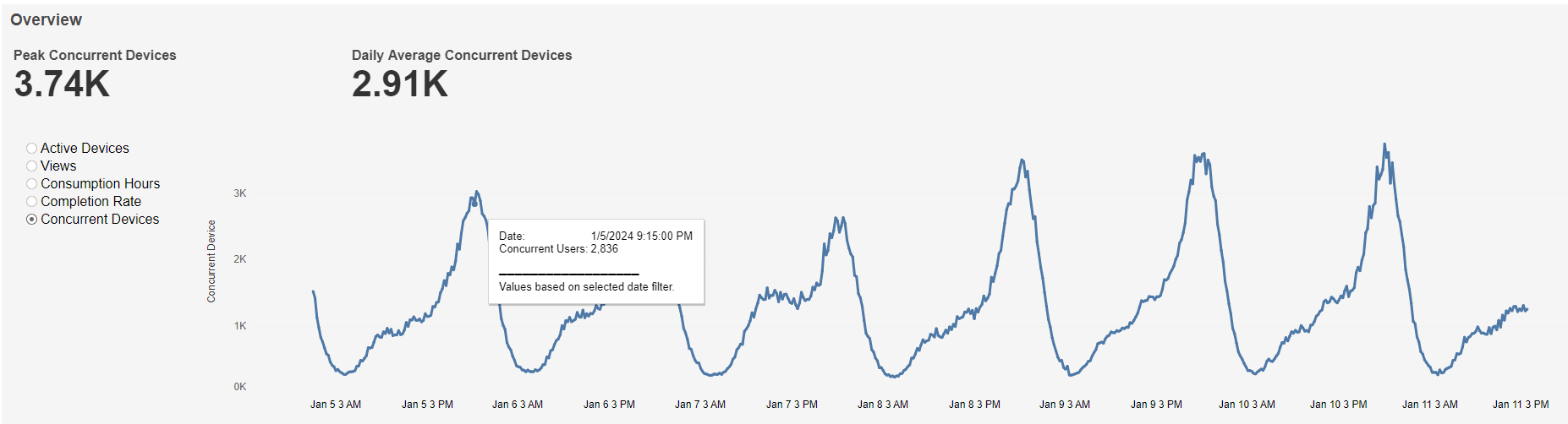 This graph shows Peak Concurrent Devices at the top left, Daily Average Concurrent Devices at the top right, and a graph of Concurrent Users over time based on the selected time interval. A mouseover tooltip gives further information.