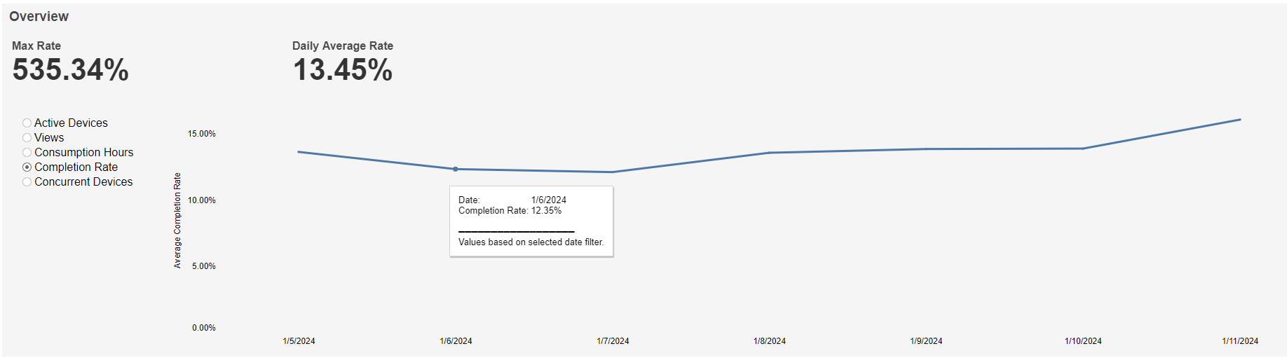 This graph shows Max Rate at the top left, Daily Average Rate at the top right, and a graph of Average Completion Rate over time based on the selected time interval. A mouseover tooltip gives further information.